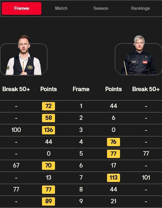 同期段中,3号种子贾德-特鲁姆普对阵尼尔-罗伯逊。比赛中,“王牌君”凭借1杆破百,连胜3局,大比分3-0朝上。“澳洲火炮”扳回一局,大比分1-3过期干预中场休息。休息追思,罗伯逊打出单杆77分再胜一局,大比分追至2-3。特鲁姆普打出1杆60+后,罗伯逊再轰1杆破百。而后,“王牌君”再轰单杆77分,连下两城,大比分6-3第2个晋级四强。
