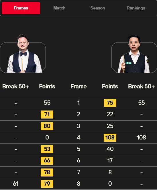 在第一阶段中,中国宿将肖国栋对阵7号种子肖恩-墨菲。比赛中,肖国栋打出单杆55分先下一城,随后,“魔术师”连扳两局,大比分2-1反超。肖国栋再轰单杆108分一杆制胜,大比分2-2干预中场休息。联系词休息追思,墨菲打出1杆60+,一波四连鞭后,大比分6-2第一个晋级半决赛。