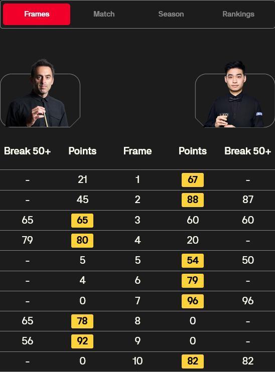 5号种子罗尼-奥沙利文对阵中国小将斯佳辉。比赛中,斯佳辉凭借1杆80+,开局先胜2局。随后,“火箭”打出2杆60+,连扳两局,大比分2-2干预中场休息。休息追思,斯佳辉再打2杆50+,一波三连鞭后,大比分5-2最初拿到赛点。其中,第七局,斯佳辉冲击147未果,留步第13颗红球。