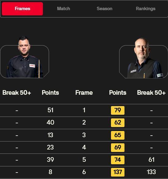 第二时段中,9号种子马克-威廉姆斯在与吉米-罗伯逊的比赛中,打出1杆60+和1杆破百,一波6连鞭后,大比分6-0横扫挺进半决赛。