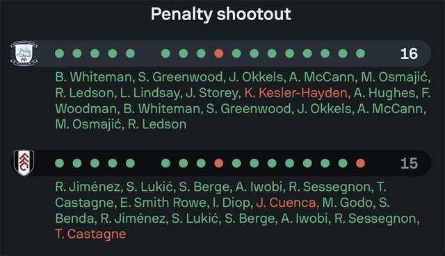 新一轮的点球大战启动,富勒姆的希门尼斯、卢基奇、贝尔热、伊沃比、塞塞尼翁先后罚进点球,普雷斯顿也一起掷中。直到第17轮,点球大战才文告斥逐:富